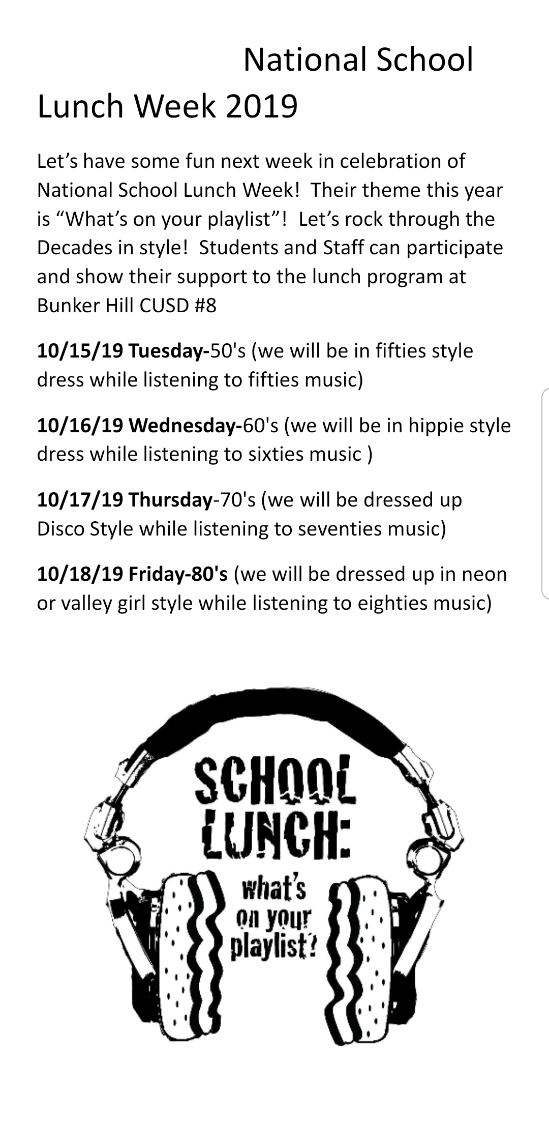 I know it is short notice but I hope that the Wolf Ridge students will dress up. I am very sorry that I am late getting this out. We are celebrating National School Lunch Week by dressing up according to a few decades (see the line up below). The Cafeteria Team and Monitors will be kicking up our heels and having a blast!